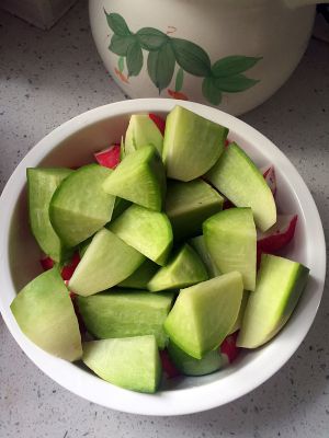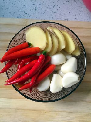 剥一整个蒜,姜洗净切大片,辣椒洗净备用