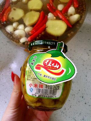 倒上一整瓶泡野山椒倒入泡菜坛中(连汁一起哦)