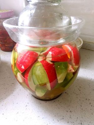 第二天将风干一晚上的萝卜放入泡菜坛中,坛檐洗净放入适量水密封