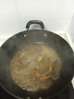腌制好 葱姜炝锅 鸡翅入锅 翻炒一下 加百事可乐 其实具体放多少还是看你能否吃甜 如果只是想有些甜味 200ml也就够了 不然就直接一听下去 中间小心点会溅手上……不要问我为什么知道(╥﹏╥) 然后就是加一些老抽提色 但是一勺其实没怎么显色 反倒如果真想不用老抽提色 可以入锅开始就用冰糖熬粘 提色效果很好……言归正传 然后就是慢慢熬了 制作途中得图~热气腾腾