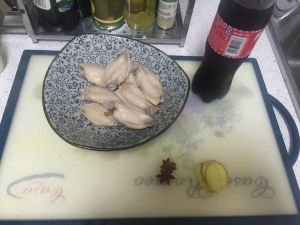 锅里放少量油,八角、姜炒香后倒入可乐,可乐开了之后,放入鸡翅,加少量盐、酱油,中火煮10分左右,大火收汁.
