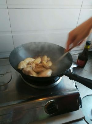 倒油爆炒香料,然后把沥干水的鸡翅放进去,注意不需要放太多油,鸡翅本身有油