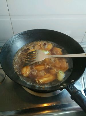 把焯好的鸡翅炒了。(放入蒜 姜 大料 料酒 酱油 最后放葱)