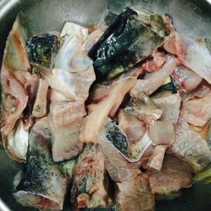 鱼切块,鸡蛋清一个,芡粉一勺,撒一些胡椒粉,料酒,姜,腌制一会儿鱼,半个小时最好