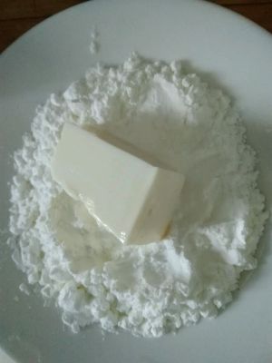 锅中油烧到5成热,在盘子里倒大量淀粉,豆腐块在淀粉里把六面都沾匀