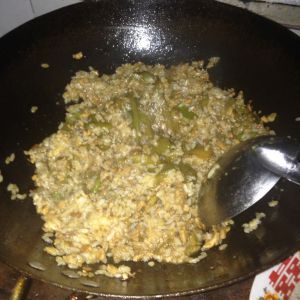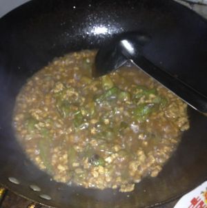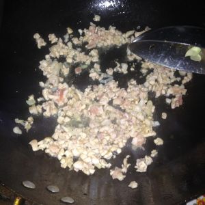 油锅里油多就盛出一点,留点油锅里,放入葱姜,炒热,放入肉末煸炒。加入少许生抽。