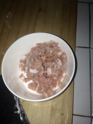 准备一下配料,大蒜切成末,香葱切成末备用,肉块先切成细丝再切成末。