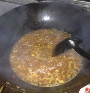 加入3勺大酱,1勺酱油,1勺白糖,1碗水调成肉酱汁。