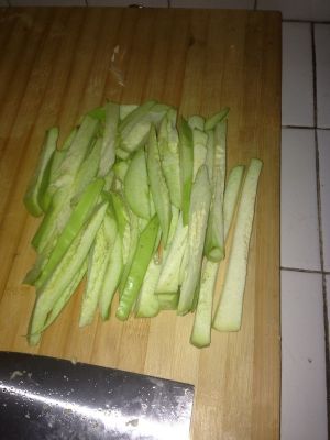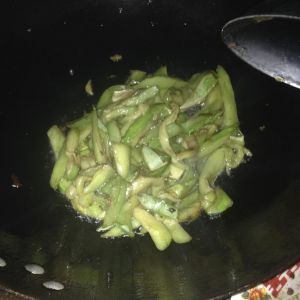 起火热油,炒茄条,多放些油,茄子很吸油,炒至茄条变色变软,盛出。