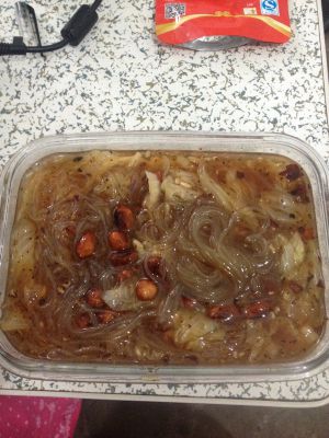 炒锅加热放油,先把蒜、辣椒、加工的花椒煸炒出香味,放入水,待水开后放入粉丝、白菜,加入少量味达美、适量醋、盐,大火煮3-5分钟,关火出锅,盛盘放入花生。味道相当不错