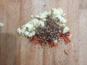蒜,辣椒用刀加工碎。锅内不要放油放入花椒粒,小火不断翻炒,刚要发黑是出锅放入蒜臼子弄碎。备用