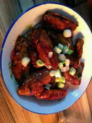 收汁完毕的鸡翅用筷子捞出入盘,撒上葱叶圈!