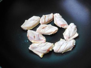 不粘锅加热后,直接放入鸡翅,有鸡皮的一面先朝下;