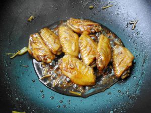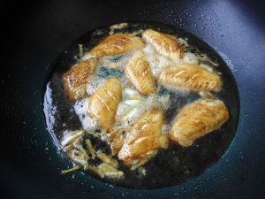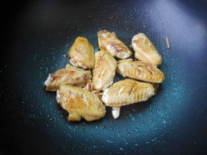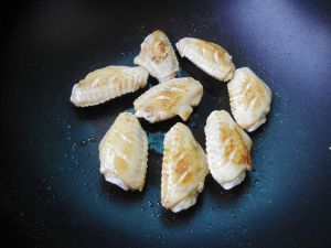 2.锅内倒油 放姜片 把鸡翅煎至金黄,把姜片夹出来