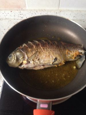 起油锅,油温热后放入姜片和蒜头爆一下,放入鲫鱼两面煎至略有点焦黄,倒入一点点黄酒去腥