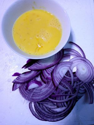 将洋葱切成粗丝,鸡蛋打成蛋液