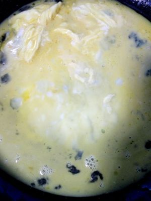 锅里放油倒入蛋液,鸡蛋稍微凝固时开始翻炒