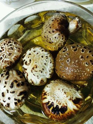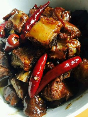 排骨洗净去血水,油烧热下一些香料(少一些,不要让香料味道盖住了排骨味)、姜、冰糖和干海椒,炒出香味加入排骨翻炒至变色,将发好的干香菇的水倒入排骨里,加生抽和老抽上色,再加点料酒,盖上锅盖煮开后火转小,差不多半个小时,将切好的香菇倒入锅里,如果水不够,继续加水煮,咸味和甜味都自己掌握,最后收水起锅