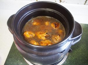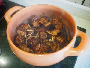 倒入酱油,一点老抽,切片的香菇、大蒜,翻炒均匀,加适量盐,中火煮半个小时,然后大火收汁