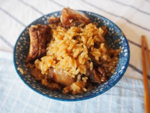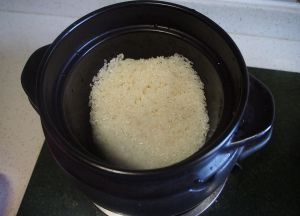 把做好的排骨倒入米饭锅内,加入够焖米饭的水,大火煮10分钟