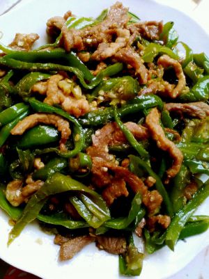 青椒切丝,大火热油倒入肉丝,放葱姜,变色后立即捞出,余油放葱姜青椒丝加入盐煸炒至变软后放鸡精,放入肉丝混和入味即可