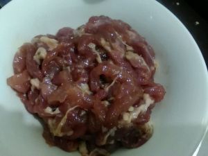 将肉切丝,打过冻的肉比较好切,用盐抓匀,感觉黏黏的了就放花椒面鸡精,酱油,最后放豆粉水,不能太干也不能太稀,这样炒出来的肉特别嫩,一定得用手抓,像我图片这种就行了