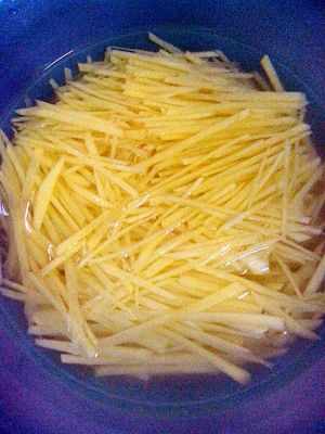 土豆削皮,洗干净切丝,用清水冲洗几遍,把淀粉冲掉,用清水泡着