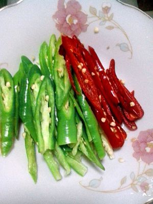 然后放入青椒翻炒,放入盐、五香粉、少许醋调味即可出锅~