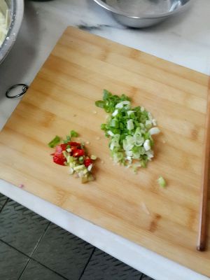 干辣椒和青椒都切成小圆圈,蒜切成片,花椒几粒。