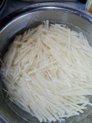 土豆切成细丝,用水淘两遍。