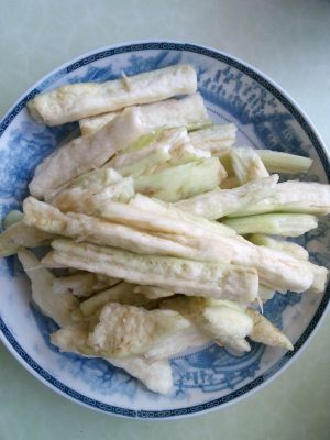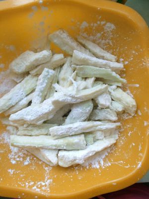 将切好的茄子加入适量的淀粉,蛋清。将淀粉均匀的裹在每块茄子上,必要时可加点清水。