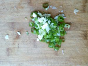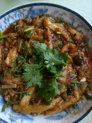 调鱼香料汁:白糖一勺,醋适量(可以多点),生抽适量,料酒一勺,麻油适量。鸡精一小勺,味精适量,淀粉适量,盐少量。我是用装了蒜的碗调的,所以碗里飘浮着蒜粒。