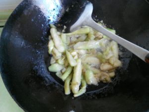 把炸好的茄子一起放入锅里炒,茄子均匀上色后,再把切碎的姜蒜倒入锅里均匀翻炒。