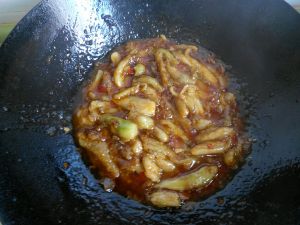 把调好的鱼香料倒入锅中,出味后尝一下,看是否还需进一步调味。小火炖一下让茄子入味,翻炒出锅即可。