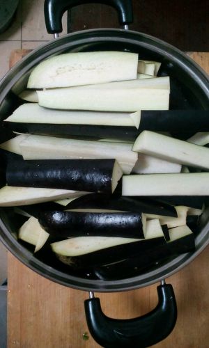 胡萝卜(或青椒等)切块;茄子去皮冲洗,切茄条(这次老夫人切的,形状可忽略),加点盐腌一下(就是可以挤掉些水分,不是特新鲜的茄子此步可省)