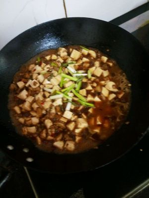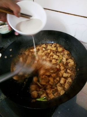 爆香葱蒜末,倒入郫县辣酱,加适量糖后加水煮沸,再加入炒好的肉末,稍微焖煮三五分钟后,加入豆腐,焖煮两三分钟后加入水淀粉勾芡,再煮十分钟。