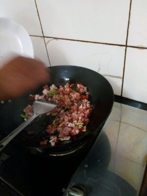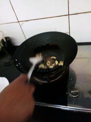 起锅烧油。油热后放入葱末蒜末。炒啊炒。炒出香味。