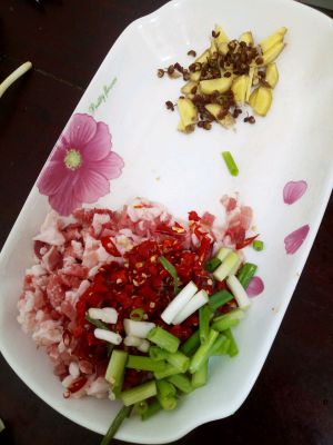 放在一起的材料,一起下锅哦,肉旁边是红辣椒沫和葱