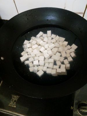 把豆腐放在水里,放一点点盐,开始煮,沸腾后捞出豆腐。