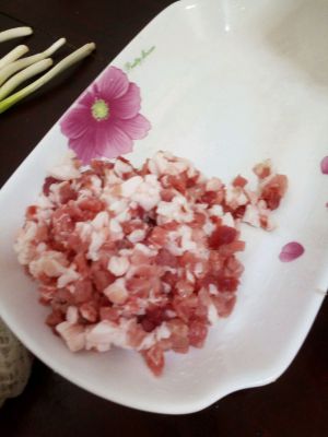 猪肉碎加入盐、葱、姜、搅拌均匀,下锅煸炒加入少许料酒去腥,随后盛入小碗备用。
