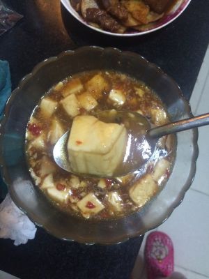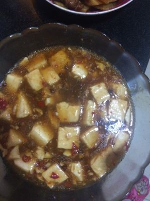 再在锅内倒入少许油,油热后将切碎的泡红椒,姜蒜,豆瓣依次入锅炒制(不能一口气全倒入,要依次),待见油颜色变红,有点炝鼻的味道出来就加水(或高汤,水不宜过多,能刚好盖着豆腐就行),水里滴几滴老抽和醋,待水快沸腾时,加入切成小块的豆腐,水开后加入之前炒好的肉馅(有的版本是豆腐起锅装盘后将肉馅撒在面上,我喜欢这时候下锅,让肉馅也吸收一些汤汁,味道更好一些),改中火煮几分钟,注意不要糊锅,加入水淀粉收汤,关火加少许味精,装盘,撒少许花椒面和葱花!