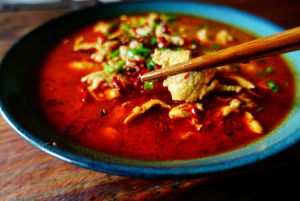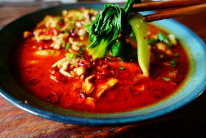 锅中加适量油,姜蒜末,干红辣椒段,火锅底料,郫县豆瓣酱炒出红油,加入适量水。