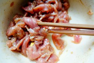 猪里脊切薄片加酱油、料酒、淀粉、蛋清朝一个方向拌匀,入味