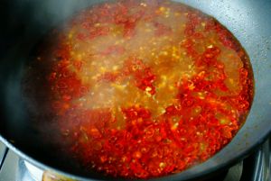 大火热油优先放入辣椒,继续依次放入洋葱、姜丝、大蒜。煸炒出香味后,加入豆瓣酱和煎至好的辣椒油煸炒3分钟。