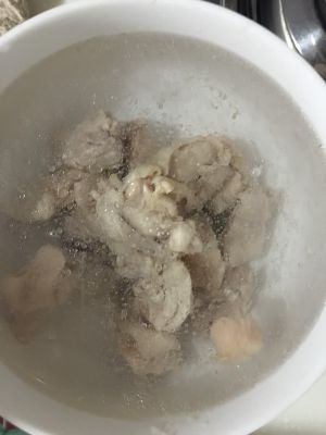 鸡肉宰成大块,锅里倒入适量清水,加入2勺料酒,把鸡肉煮一下,除去血沫,水烧开后煮7、8分钟就可以了