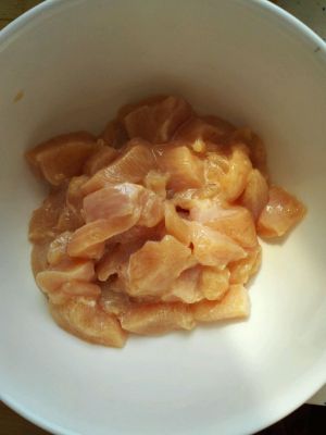 鸡肉切丁,加盐2克,酱油5克,水淀粉适量拌匀。