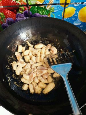 另起锅,热锅热油,放鸡丁翻炒,均匀变色。