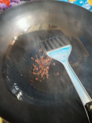 另起油锅,炸花椒。花椒炸好可沥出,如不介意不捞出来也可以。
