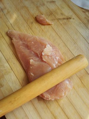 用擀面杖敲打鸡肉,均匀的敲打,力度以不会把鸡肉打烂为宜。