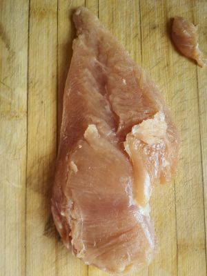 鸡胸一块洗净剔去筋膜和脂肪,用厨房纸巾吸干水分。